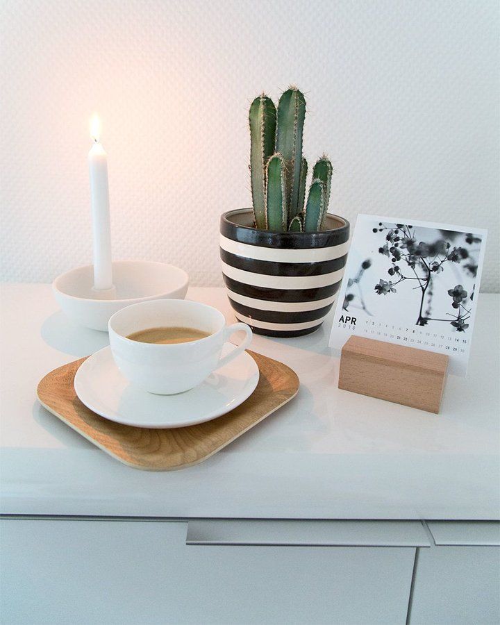 Kalender, 2018, Kalender2018, April, Kalenderblatt, Kerze, Kerzenhalter, Kerzenständer, Kaktus, Kaffee, Tablett, Interior, Weiß, Holz, Wohnzimmer, Anrichte, Sideboard