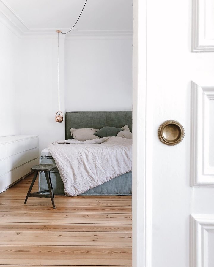 Altbau, Schlafzimmer, Bett, Bettwäsche, Hocker, Holzboden, Hängeleuchte