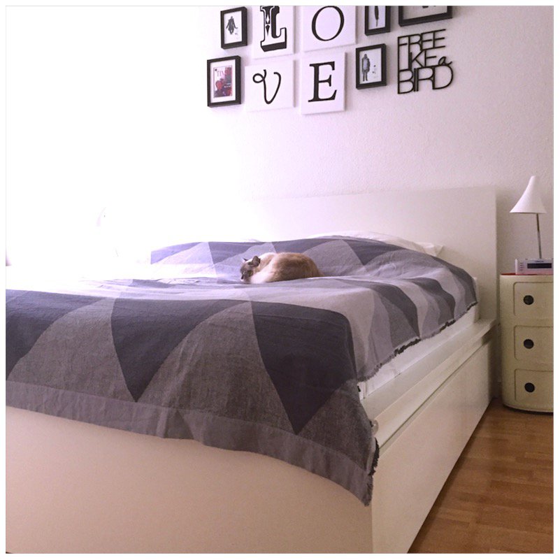 Bett, großes Bett, Bilderwand, Schlafzimmer einrichten, Schlafzimmer Makeover, katze auf bett, Componibili weiß, Componibili als Nachttisch