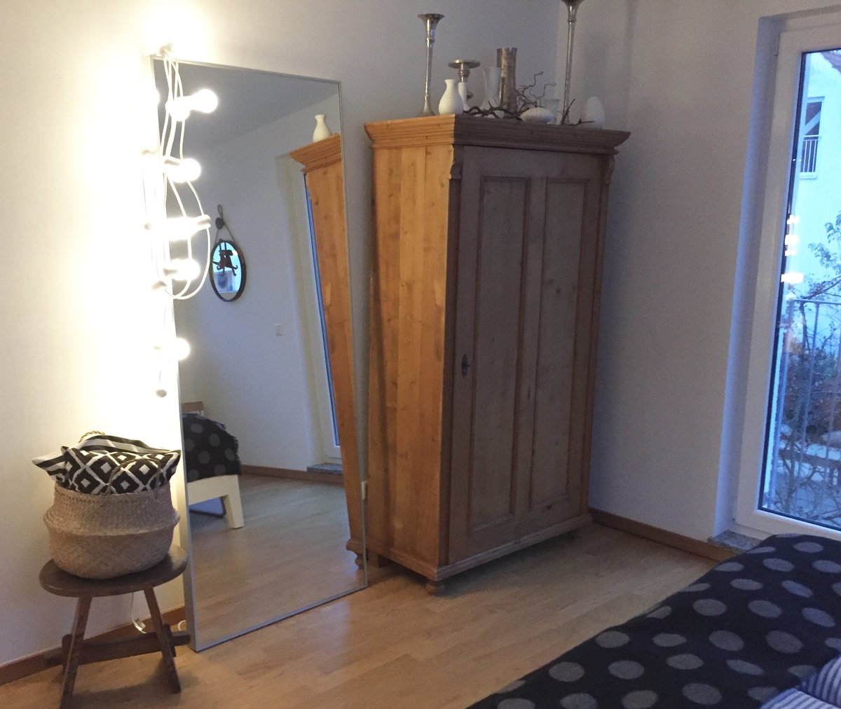 Alter Holzschrank, Lichterkette, Großer Spiegel, Holzhocker, Bloomingville Korb