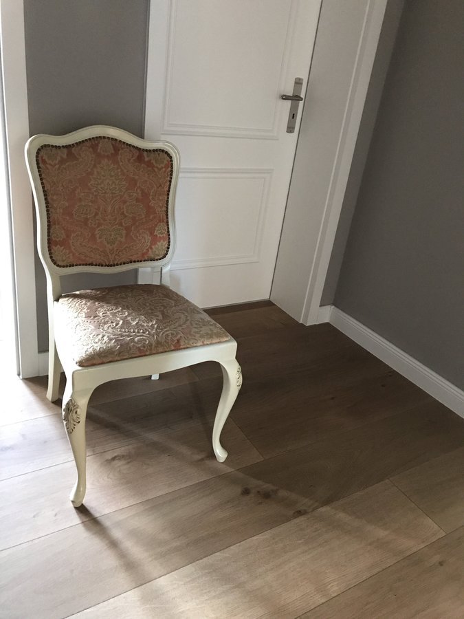 Gefunden! Im Lager unseres Dealers für gebrauchte Büromöbel. Der alte Schlafzimmerstuhl der Frau, der dem kleinen Bettchen fürs Enkelkind weichen musste. Der Mann brachte es nicht übers Herz ihn wegzuwerfen. Gut so. Reaktion: Sofort über beide Ohren schockverliebt. Nun steht er in unserem Flur und darf wieder Tageslicht schnuppern.