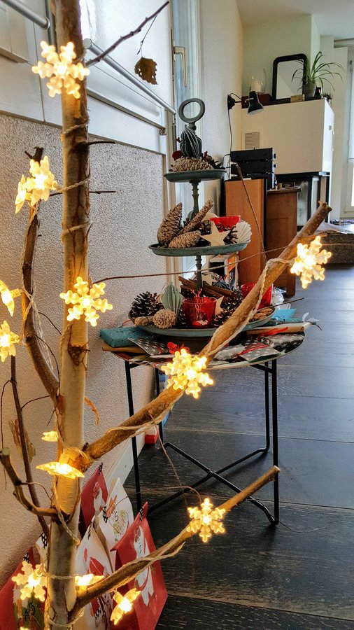 Unsere Adventsbeleuchtung am Birkenast. Danke an unsere Nachbarin für den tollen Ast ; ).