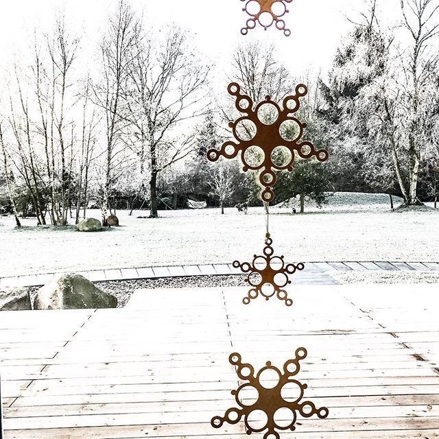 Schneeflocken/Eisblumen aus Holz zieren unsere Scheibe. Der Schnee lässt noch auf sich warten.