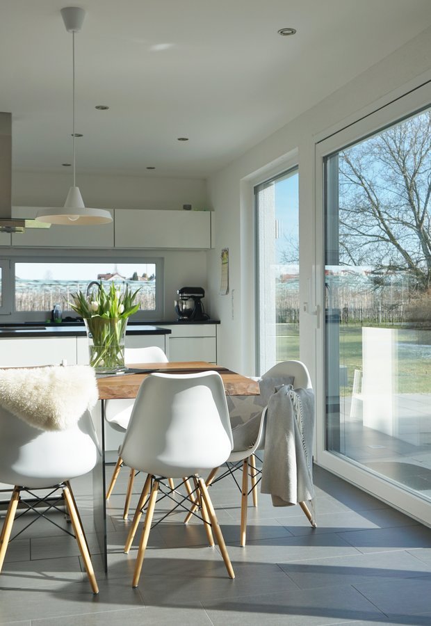 Essbereich, Frühling, Frühlingsblumen, Frühlingsdeko, Fell, Fensterfront, Sonnenschein