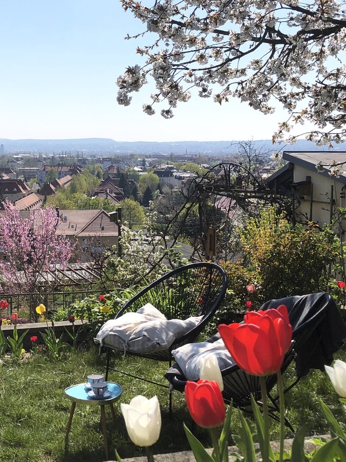 Schrebergarten, Tulpen, Acapulco Chair, Nierentisch, Dresden, Kirschblüte, Pfirsichblüte