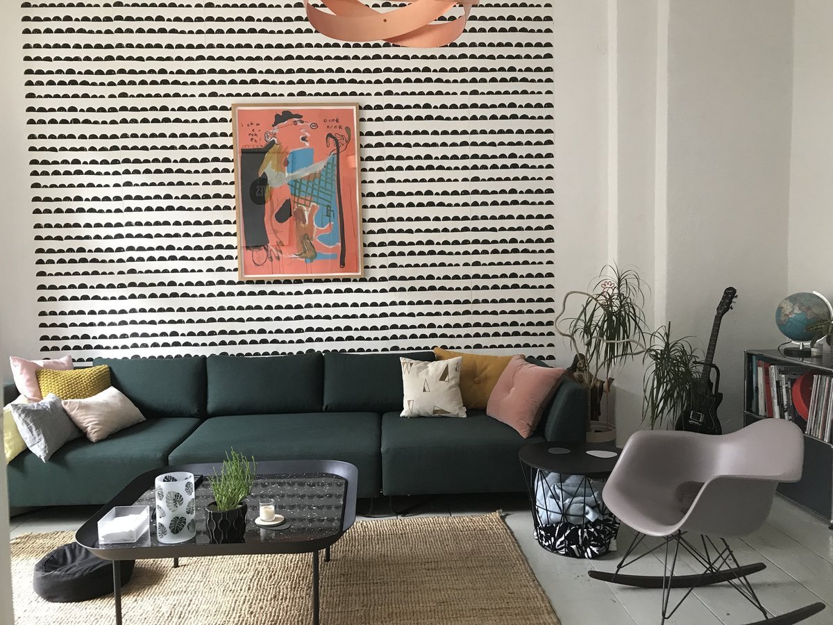 Schweren Herzens haben wir uns von unserem alten Mario Bellini Sofa getrennt. Wir wollten etwas, auf dem man fester und höher sitzt. Grüner Samt war meine Idee, aber mit Kind und Hund kam das nicht in Frage. Aber grün sollte es weiterhin sein. Wir haben uns für das Bolia Orlando entschieden. Und einem passenden Tisch dazu. Platz war dann auch für meinen Eames Schaukelstuhl. Und einen Ferm Living wire basket in all black. Senf und rosa farbene Kissen von Hay fanden auch noch Platz. Und für das USM Haller Regal durfte auch der 50er Servierwagen weichen. Die Kunst auf der Halfmoon Tapete ist von dem Künstler Hoosen. Der macht irre Sachen und ist ein Bekannter von uns.