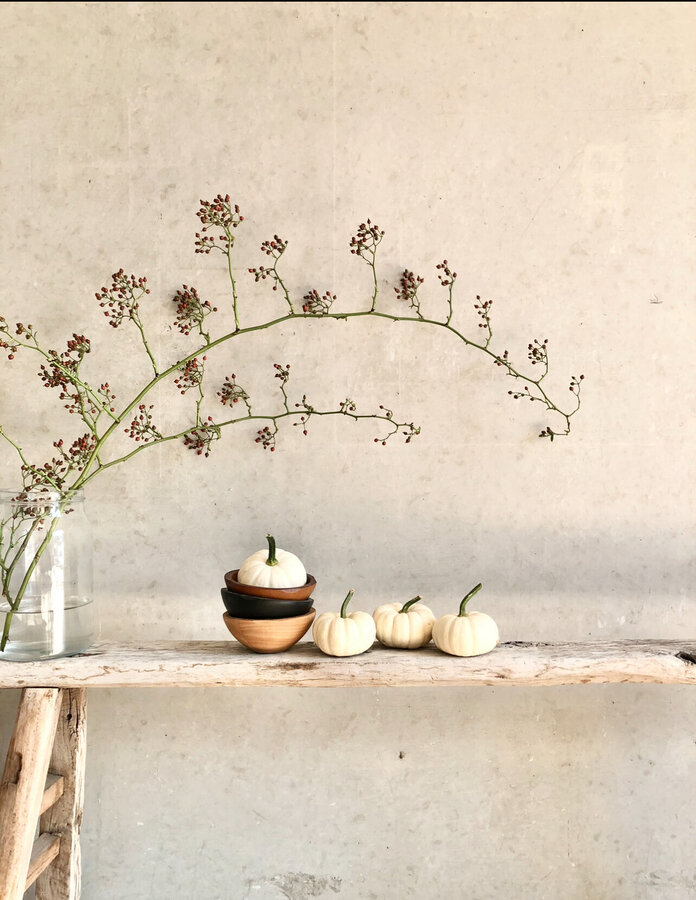 Kürbis, Baby Boos, Weisser Kürbis, September, Spätsommer, Herbstdeko, Herbstfarben, Herbststimmung, Herbst, Betonwand, Holzbank, Vintage Deko, Vintage, Hagebutten, Herbstboten, Kürbisliebe