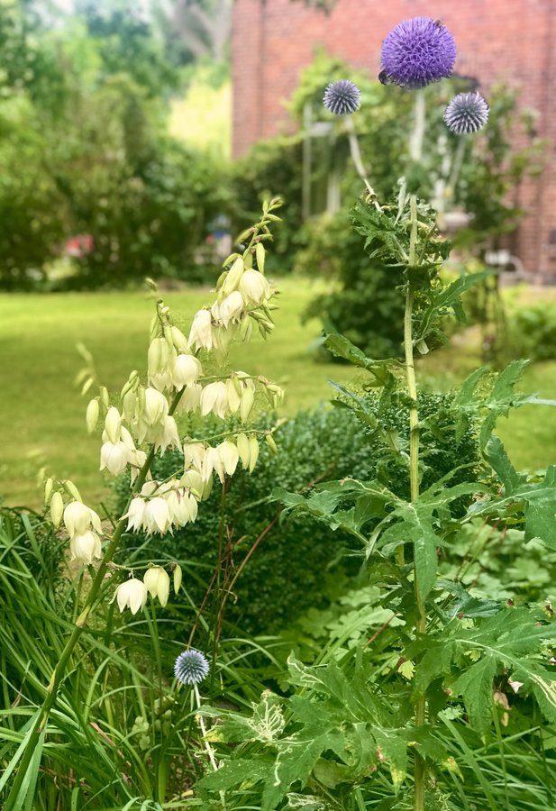 Garten, Haus, Backsteinwand, Palmlilie, Edeldistel