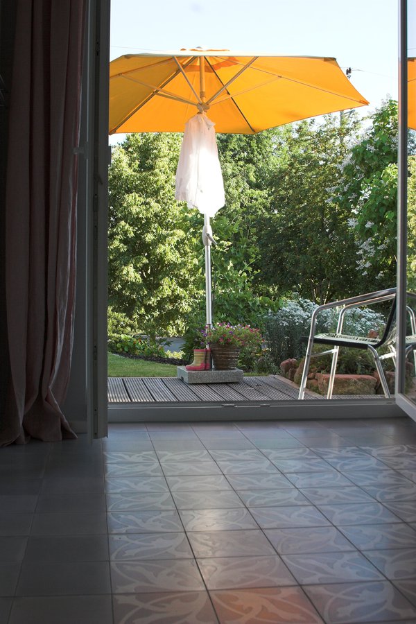 errasse, Sommer, Holzterasse, Sonnenschirm, Sonne