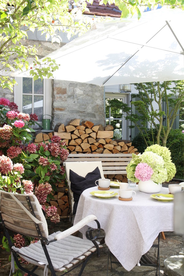 Hofgarten, Frühstück, Hortensien, Kaminholz