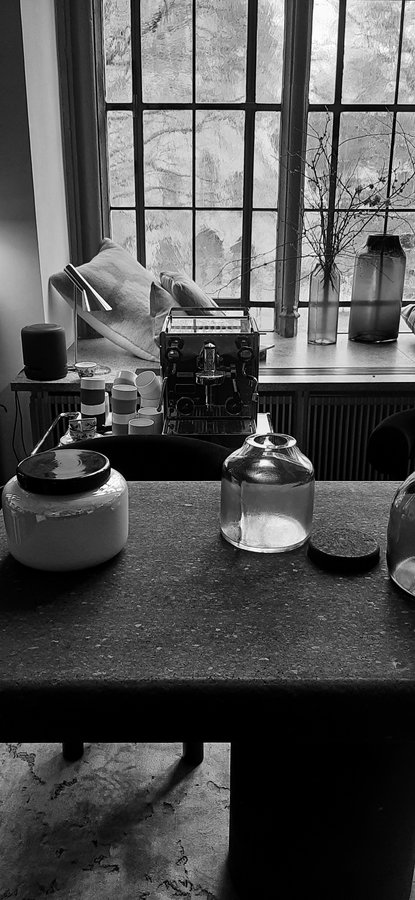 Eines meiner Lieblingsbilder. Ganz bewusst in Schwarz-Weiß. Gleich beim Betreten des "Happy Places" fielen mir der extravagante Korktisch von Tom Dixon mit der edlen Espressomaschine von Profitec und all die wunderbar passend ausgewählten Accessoires auf. Es war ein Vergnügen, einen Espresso zu schlürfen und sich mit anderen Besuchern auszutauschen und ab und an durch die neugothischen Spitzbogenfenster über den Platz zu Sankt Gereon rüberzuschauen.