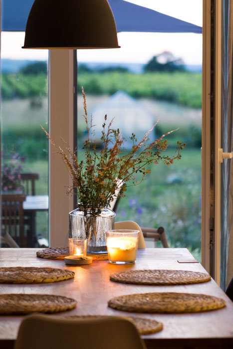 Esstisch, Essplatz, Gartenblick, Blumenvase, Wildblumen