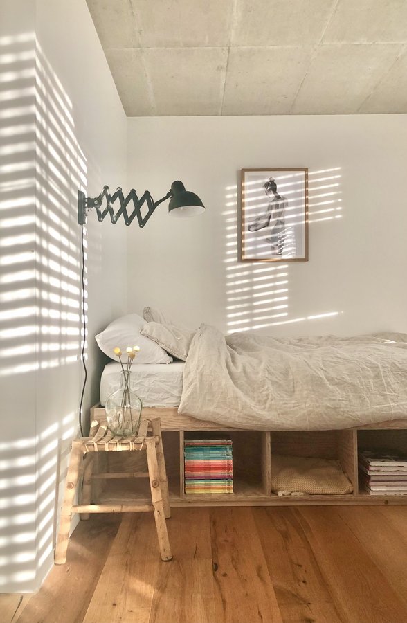 Sonne in Kombination mit Storen sorgen für zauberhafte Lichtstimmung im Gästezimmer.