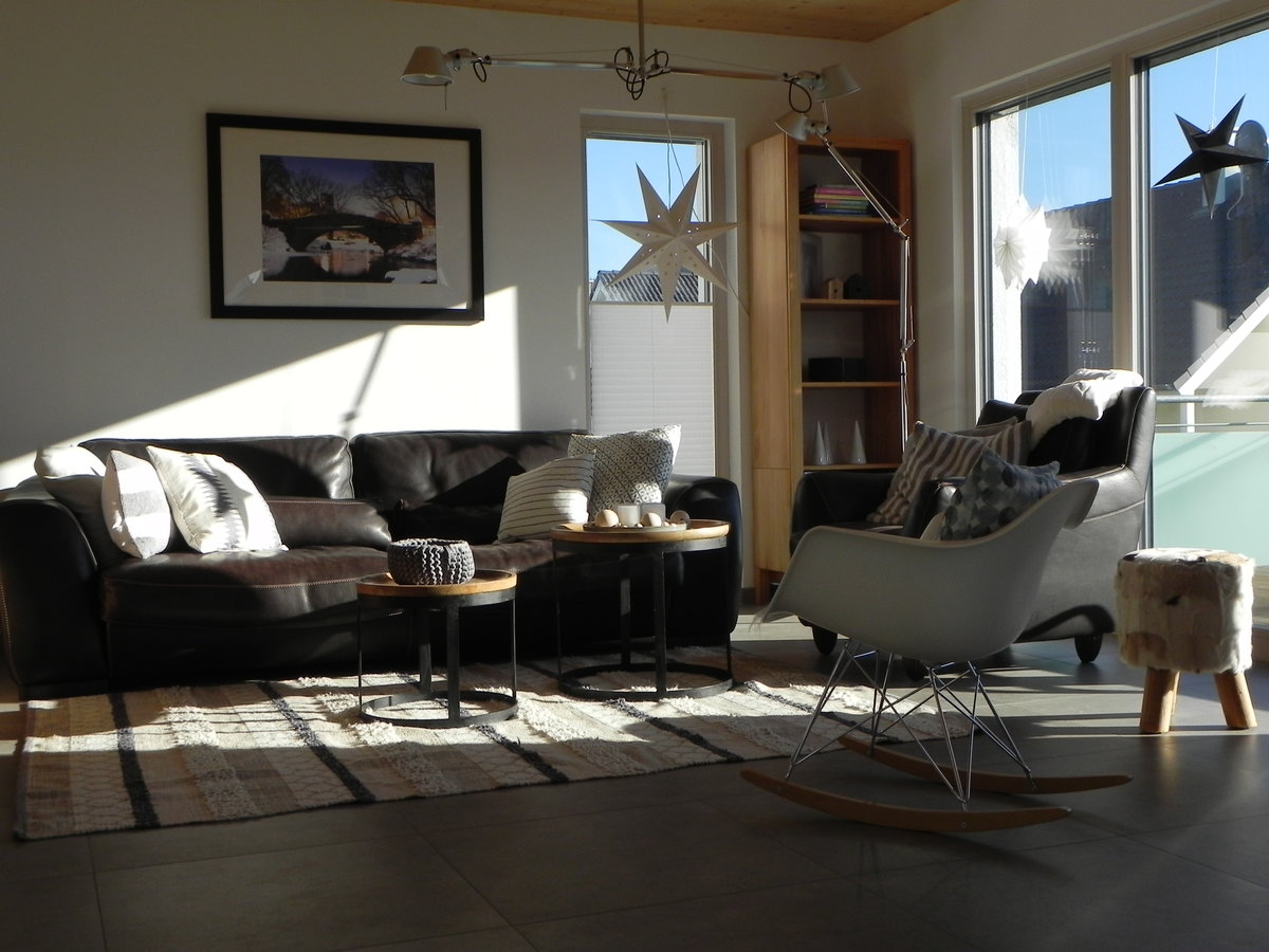 Ledersofa, viele Kissen, Adventskranz, Rocking Chair, Hocker, Sterne
