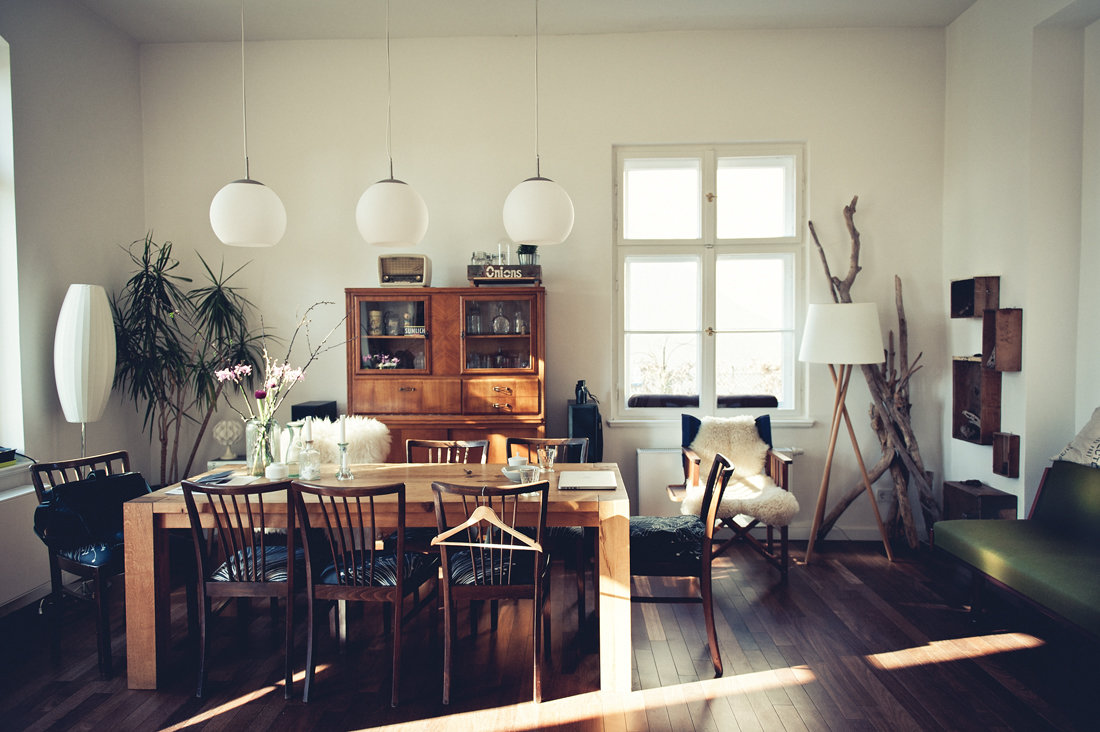 Sonnenlicht, Esszimmer, Hans Wegner Sofa, Holz, Holztisch, Hängelampe, Holzdiele