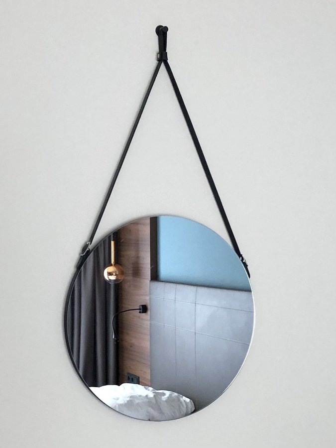 Mit einem Ledergürtel improvisiert, hängt der Spiegel an der Wand.