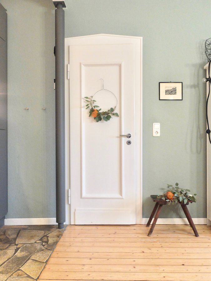 ich war heute morgen beim blumenhändler und wollte protea, die gabs nicht mehr, so hab ich meinen liebling, die spinne mitgenommen und einen ganzen arm voller eukalyptus. dann hab ich die blüte in so ein wasserdingens gepfercht, an meinen neuen kleiderbügelkranz gebunden und mit eukalyptus getarnt. voila, mein neuer türkranz, an der alten tür(die ich sehr liebe) vor der salbei-eukalyptus-oder besser fraeuleinnussboeckgrünen wand. habt ein schönes wochenende💚