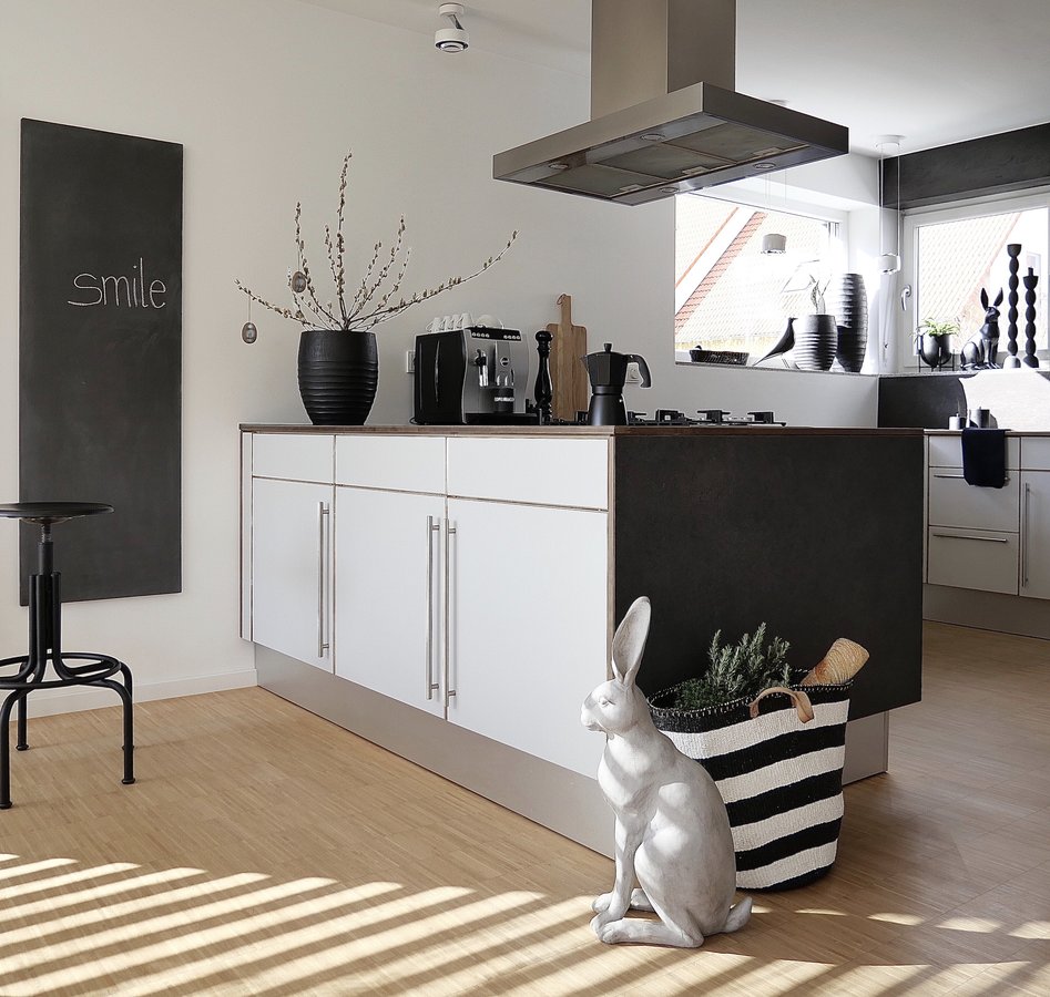 Kitchen, Küche, Dekoideen, Dekoration, Frühling, Frühlingsdeko, schwarz weiß, Offene Küche, Parkett, Holzboden