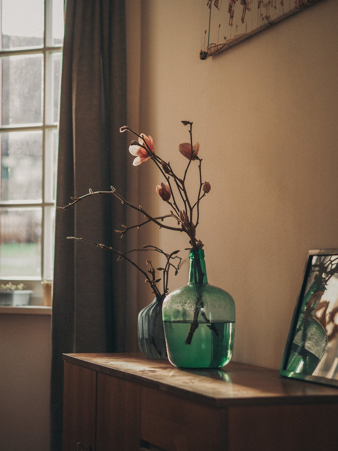 Magnolie, Weinballon, Sideboard, Vorhänge, Sprossenfenster