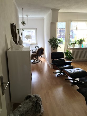 Wohnzimmer, Weiss, Eames Lounge Chair, corniche ablagebord, Kuhfell, Kalkanstrich