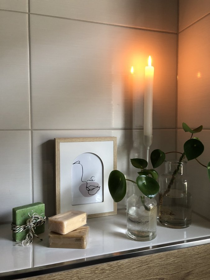 Bad, Deko im Bad, Seifen, Apothekerflaschen, Etwas grün, Kerzenschein, Bild