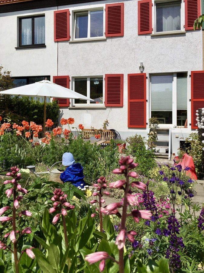 Wir haben lange nach den passenden Läden, zu den fast hundert Jahre alten, gesucht. Jetzt ist die hintere Hausansicht stimmig und es ist noch etwas bunter bei uns im Garten ❤️💜🧡.