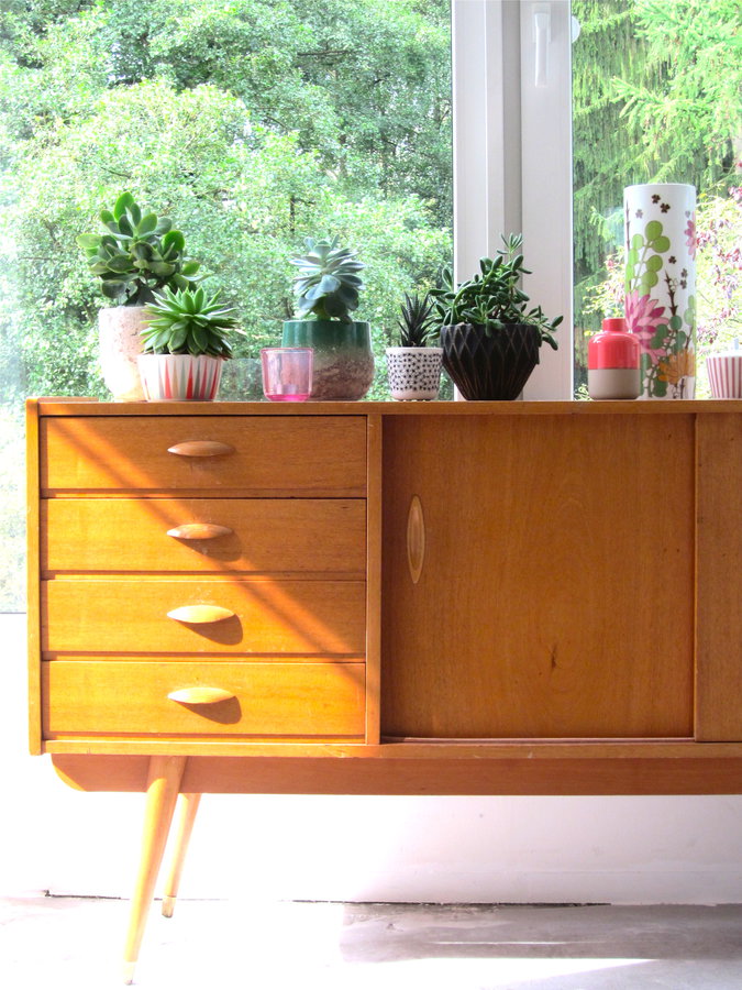 sideboard 60 er, vintage Blumentöpfe, Vase, Hübsch Interior