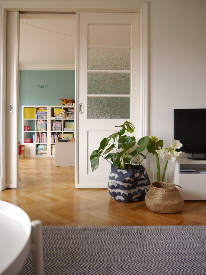 Altbau, Schiebetür, Mein tv, Wohnzimmer, Monstera, Wandfarbe türkis