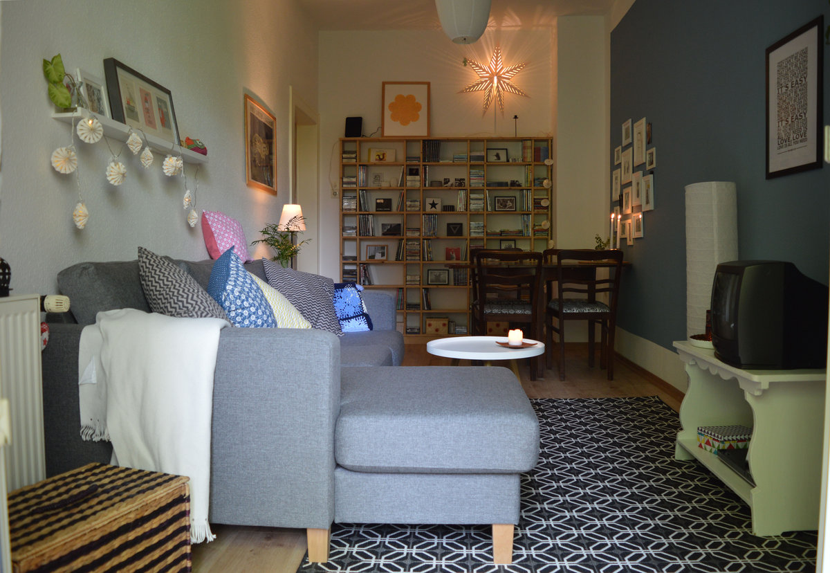 Nachdem ich für 2 1/2 Monate meine Wohnung aufgrund eines Wasserschadens verlassen musste, hat das Wohnzimmer einen neuen Anstrich sowie eine Wand in Taubenblau bekommen und wurde komplett umgeräumt. Natürlich schluckt die neue dunkle Wandfarbe noch mehr Licht, dennoch fühle ich mich hier nun endlich wieder wohl. Obwohl der Raum sehr klein ist, hat sogar noch ein Ecksofa und eine kleine Essecke Platz gefunden ...