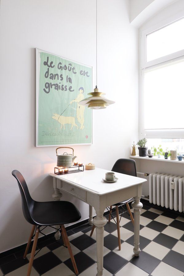 Küche, Essplatz, Schachbrettmuster, Fliesenboden, Messinglampe, Teekanne, Stövchen