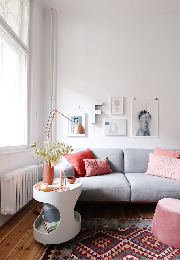Wohnzimmer, Terracotta, Opal Tisch, Graues Sofa, Kupferlampe, Pouf, avocadogefärbte Kissen, Leuchtbuchstabe, Kelim, Deichgras, Hay Lup, Skagerak Vase