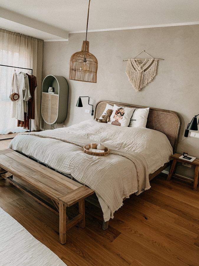 Schlafzimmer, Schlafzimmerinspo, Boho, Bohoschlafzimmer, Rattan, Wienergeflecht, Bohobett