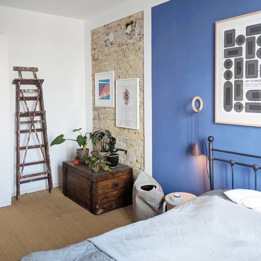 Schlafzimmer, wandfarbe blau, Leiter, Truhe, Backsteinwand