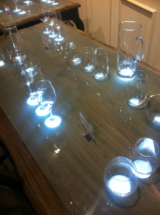 Aus dem Tisch wurden kreisrunde Scheiben geschnitten die dann einfach mit Plexiglas hinterlegt wurden. Von unten wurde dann eine LED Lampe angebracht die durch die Löcher scheint. Die Löcher sind genau so angebracht dass die Füße der Gläser darauf passen. Ich finde das ist eine SUPER IDEE für Theken, Gastronomie oder Warenpräsentation
