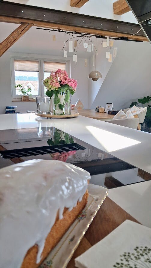 Küche, Weiße Arbeitsplatte, Scheunenumbau, Hortensien