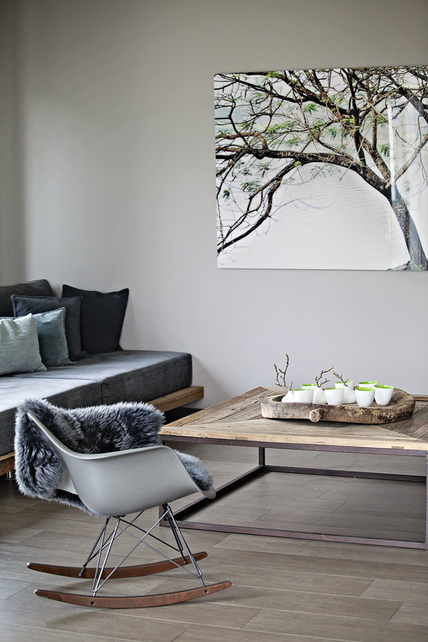 Sofa, Holzbrett, Couchtisch, großes Foto