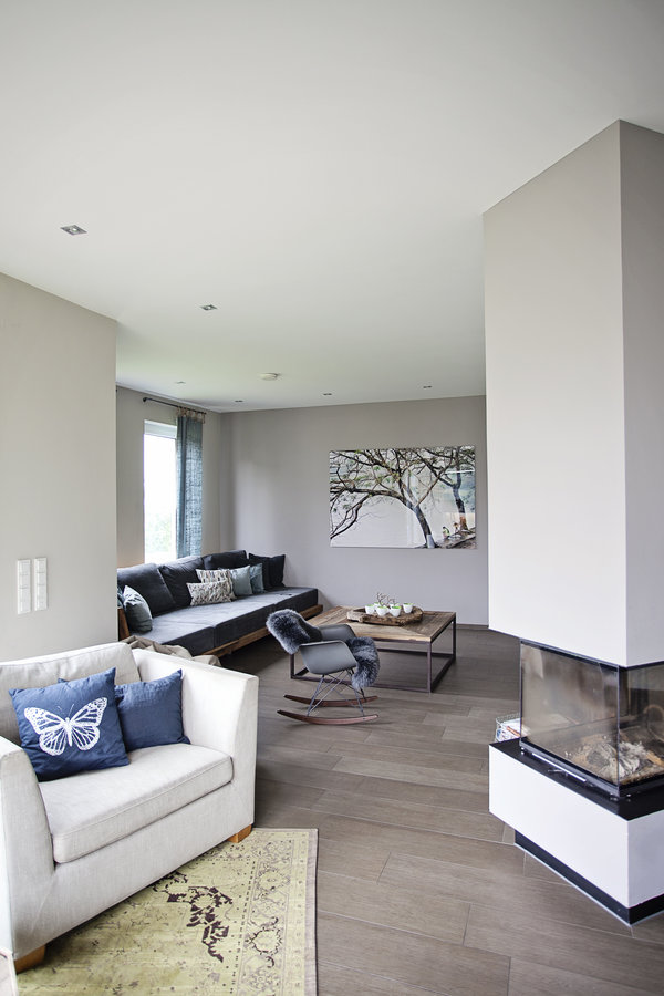 Wohnzimmer, Sofa, Kamin, Holztisch, Sofakissen, Wandfarbe, Grau