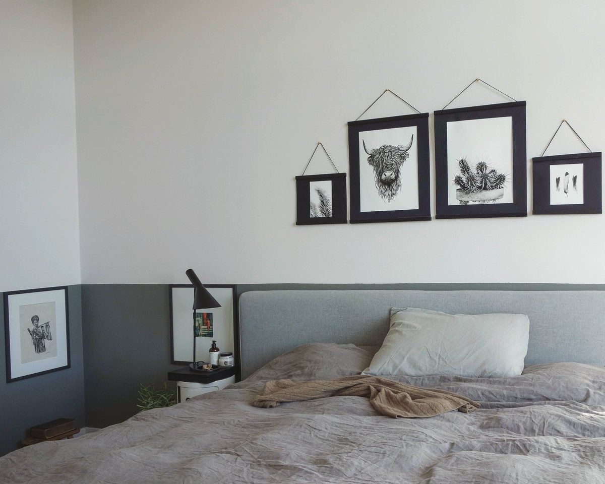 Schlafzimmer, Wandfarbe, Monochrom, artwall, Leinenbettwäsche