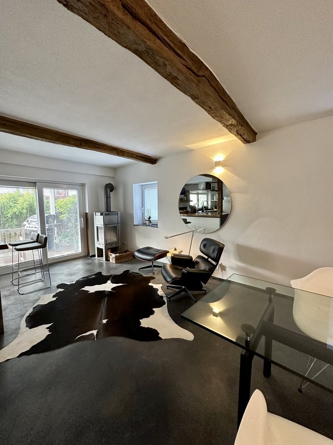 Lieblingsplatz, Ofen, Kuhfell, Industrieboden, Eichenbalken