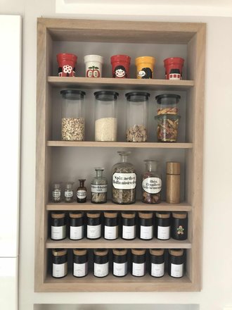 Apothekerschrank, Apothekerfläschchen, Schreibmaschine, Weinballons, Altbau, Wohnzimmer, Rattanstuhl, Rattanlampe