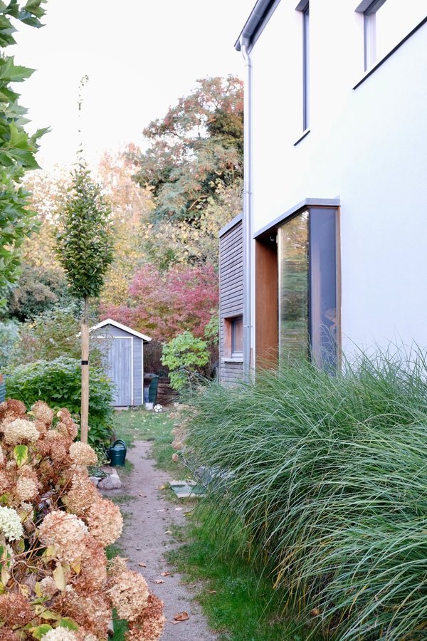 ..und noch ein Bild aus dem abendlichen Garten. Diesmal von der Nordseite. HIer wallen die Gräser über den noch unfertigen Weg zum Haus, die Ballhortensien begleiten den Besucher mit derzeit rostfarbenen Blüten und ganz frisch an Bord - die Säulenbuche neben dem Eingang, die hier wiederum den leider eingegangenen Rotdorn ablöst.