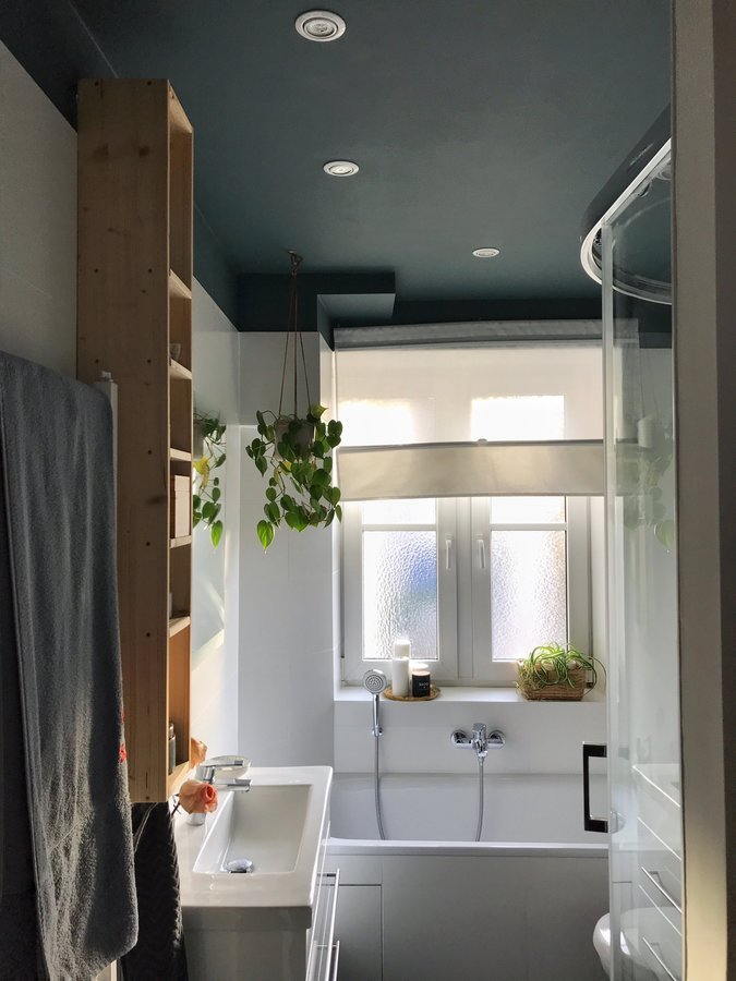 Unser Bad war klein, neu und sehr sehr kühl, da alles weiß und gefliest ist. Durch die farbige Decke bekommt es viel mehr Tiefe und Wärme ☺️