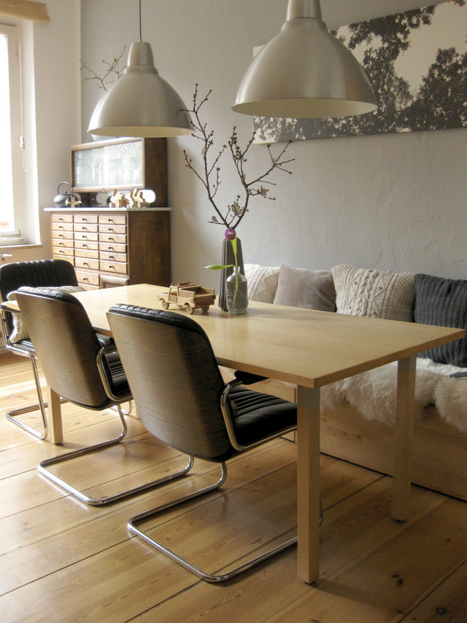 Tisch DIY, Stühle Stoll Giroflex aus den 60ern, Banktruhen, Leuchten, Bild und Vase von Ikea, Schrank aus einer ehemaligen Zahnarztpraxis der 30er Jahre, Laster vom Flohmarkt, Kissen DIY, Dielenboden Original 1886.