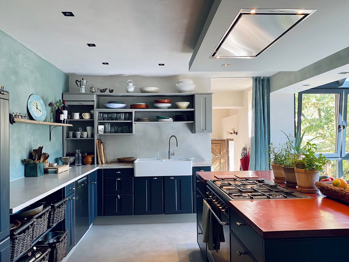 unsere alte Küche haben wir zum Teil aufgepeppt durch einen neuen Anstrich, die alten Fliesen entfernt und einen neuen Spachtelboden erstellt, die Arbeitsplatten sind in Beton Ciré gespachtelt