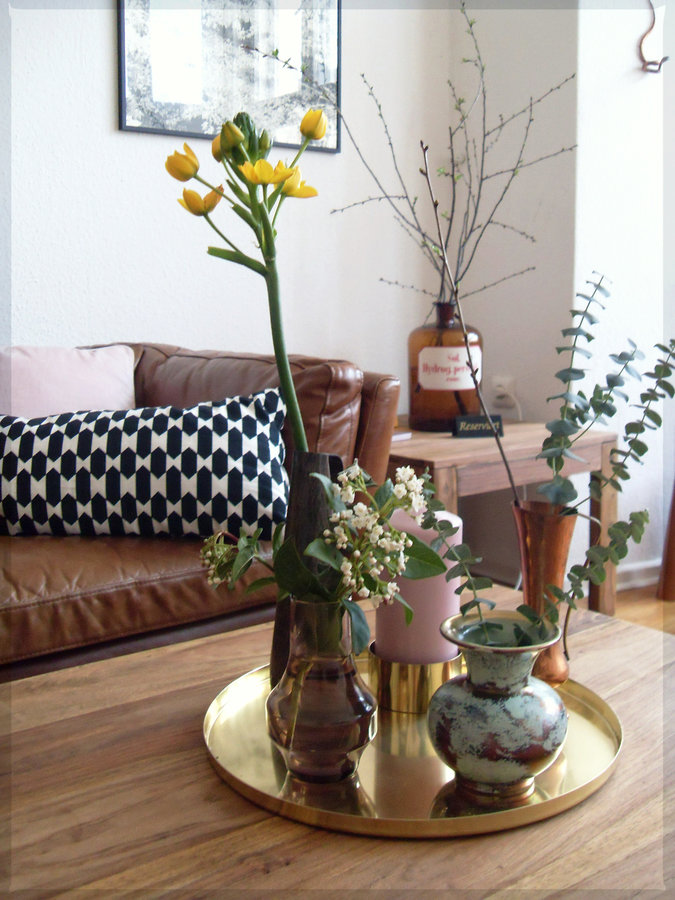 Vasen, Tablett gold, apotheken gefäß, Geometrisches Muster, Samtkissen, Kupfer Deko, Ledercouch, Holztisch, rosa Akzente, Frische Blumen, Glasvase, Kerzenständer Metall, Eukalyptus, Sträucher