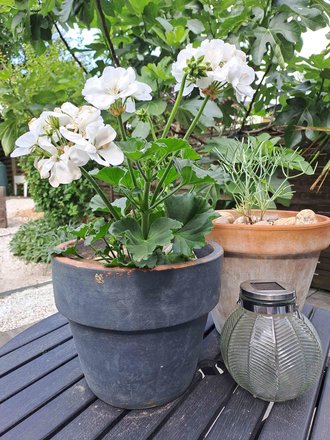 Dafür sind die Dauerblüher wie geschaffen. Ich mag ihren etwas strengen unverkennbaren Geruch, er erinnert mich an meine Kindheit in der großelterlichen Gärtnerei. In Schweden sind Geranien sehr beliebt. Dort schmücken sie in Weiß und Rot fast jedes Haus. Ich habe mich für Weiß entschieden, es passt einfach gut zur Holzfassade, zudem hat der Stuhl ein neues Leben.