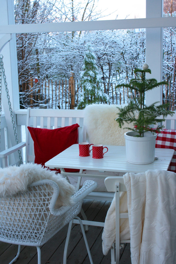 Tannenbaum, Schnee, Schwedenhaus, rotes Haus, Garten, Veranda, Zuhause, Hollywoodschaukel, verschneit, Vorweihnachtlich, Holzhaus