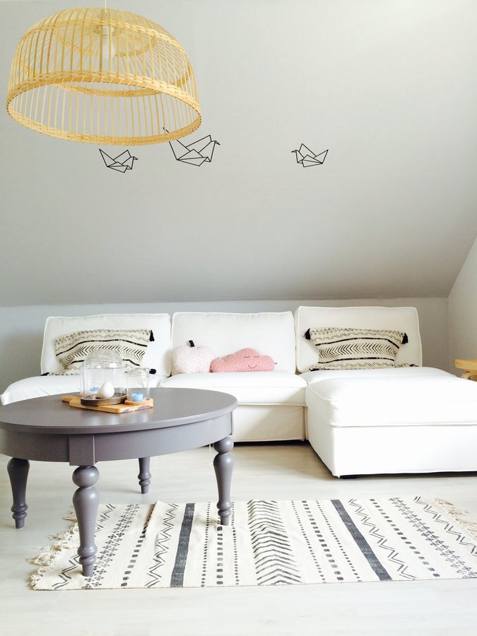 Wohnzimmer, Kivik, Origamivögel, Cloche, Teppich, hmhome