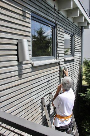 Verwittertes Terrassenholz, Gräser und Röschen vorm Haus. Letzteren hat der Regen der vergangenen Tage nicht geschadet. Im Gegenteil. Sie scheinen die Bodenfeuchte zu genießen und blühen so schön wie seit Jahren nicht. Ein richtiger Wellness Sommer für den Garten.
