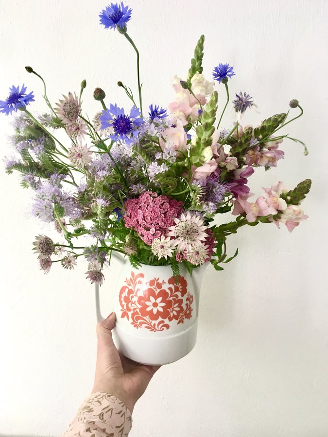 Viele Blumen aus meinem Garten. Nicht nur aus meinem, aber immerhin die Kornblumen, Phacelie und Schafgarbe sind es. Löwenmäulchen und Sterndolde wachsen da auch, tragen aber leider noch keine Blüte. Die wunderschöne Vintagekanne ist ein Fundstück aus der Studienzeit und wohnt jetzt schon seit 22 Jahren bei mir – bisher wurde sie von jeder Ausmisterei verschont.